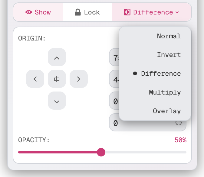 Five blend modes for comparing your overlay against the live page: Normal, Difference, Invert, Multiply, Overlay.